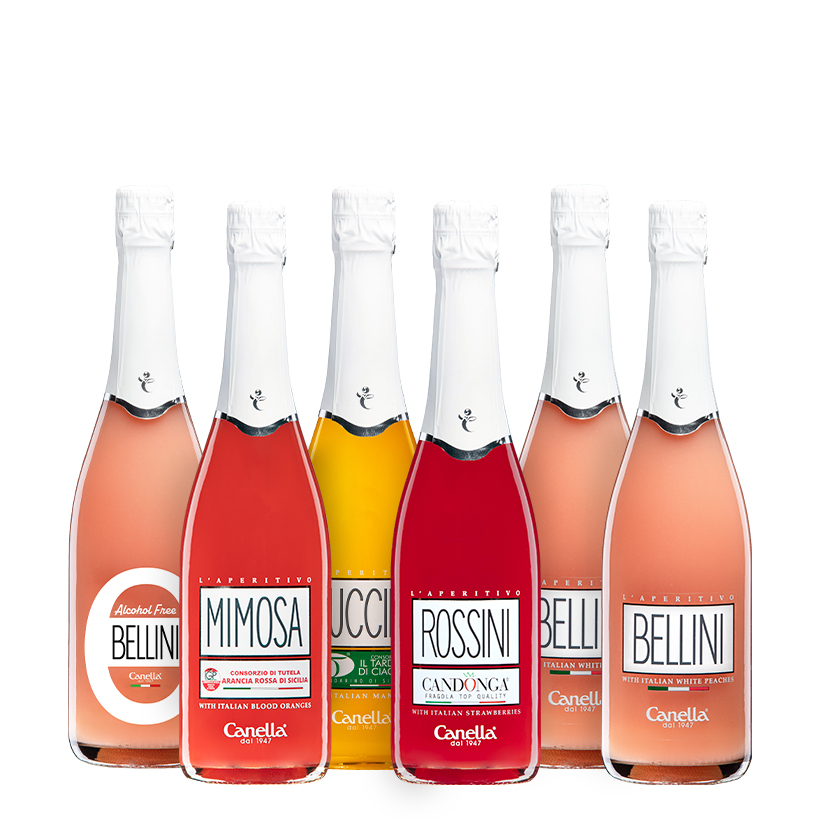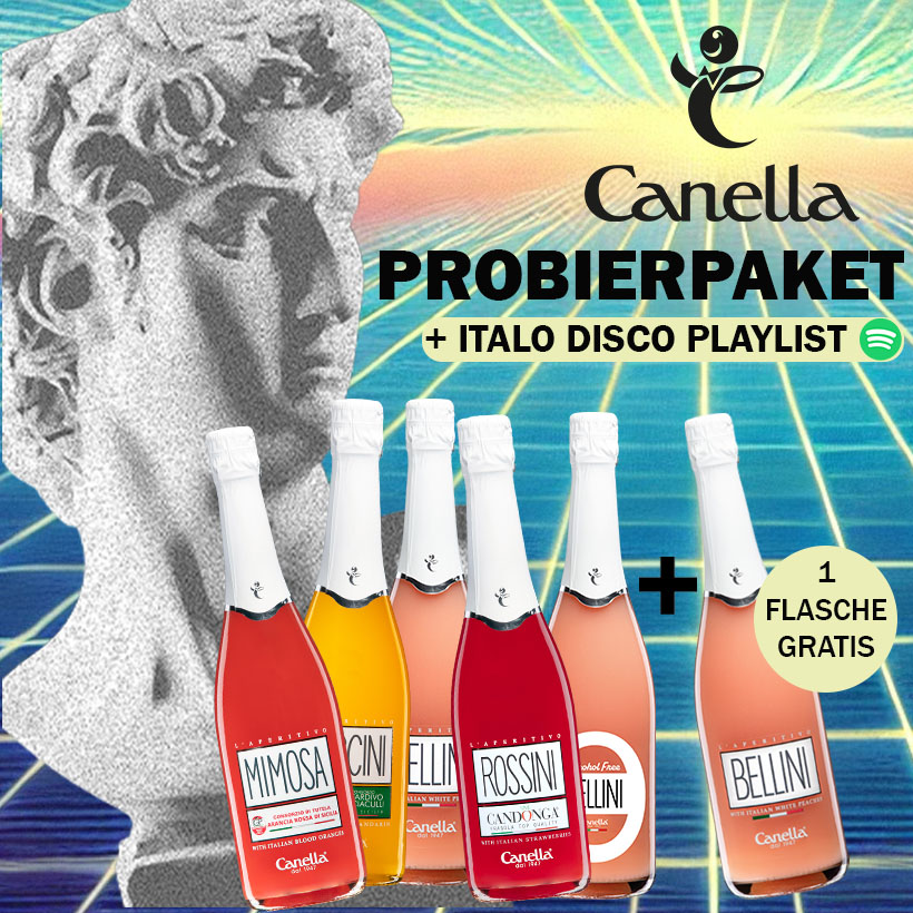 Entdecken Sie die Vielfalt prickelnden Genusses mit dem Canella Probierpaket zum Kennenlernen! 5 verschiedene L'Aperitivo Cocktails + 1 Flasche Bellini gratis
