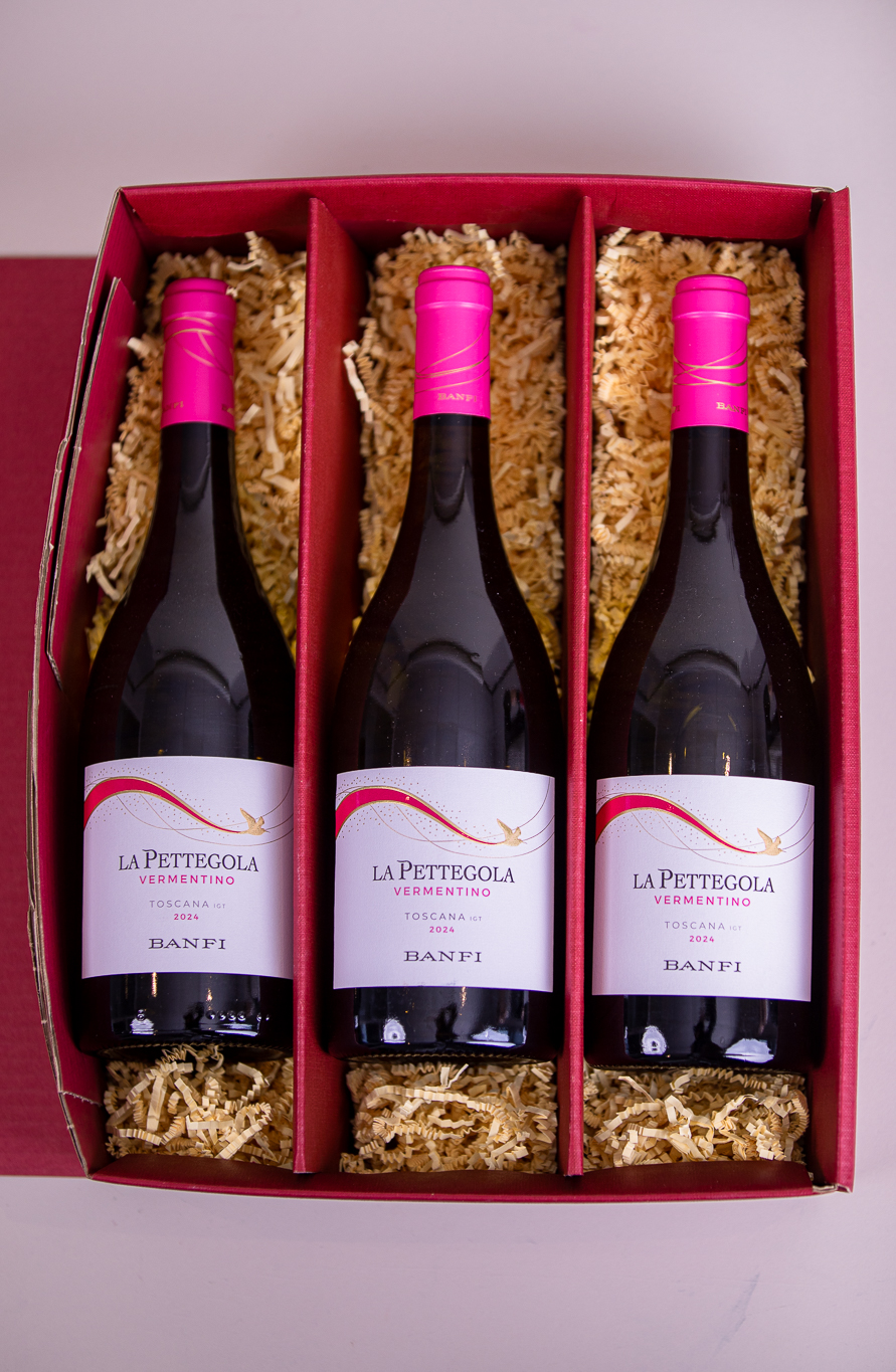 Drei Flaschen davon, verpackt in einer hochwertigen Geschenkbox, liebevoll von Hand zusammengestellt. Ob zum Abendessen mitgebracht, zum Geburtstag überreicht oder einfach als Zeichen, dass man an jemanden denkt — La Pettegola passt immer, wenn es leicht und gesellig werden soll.