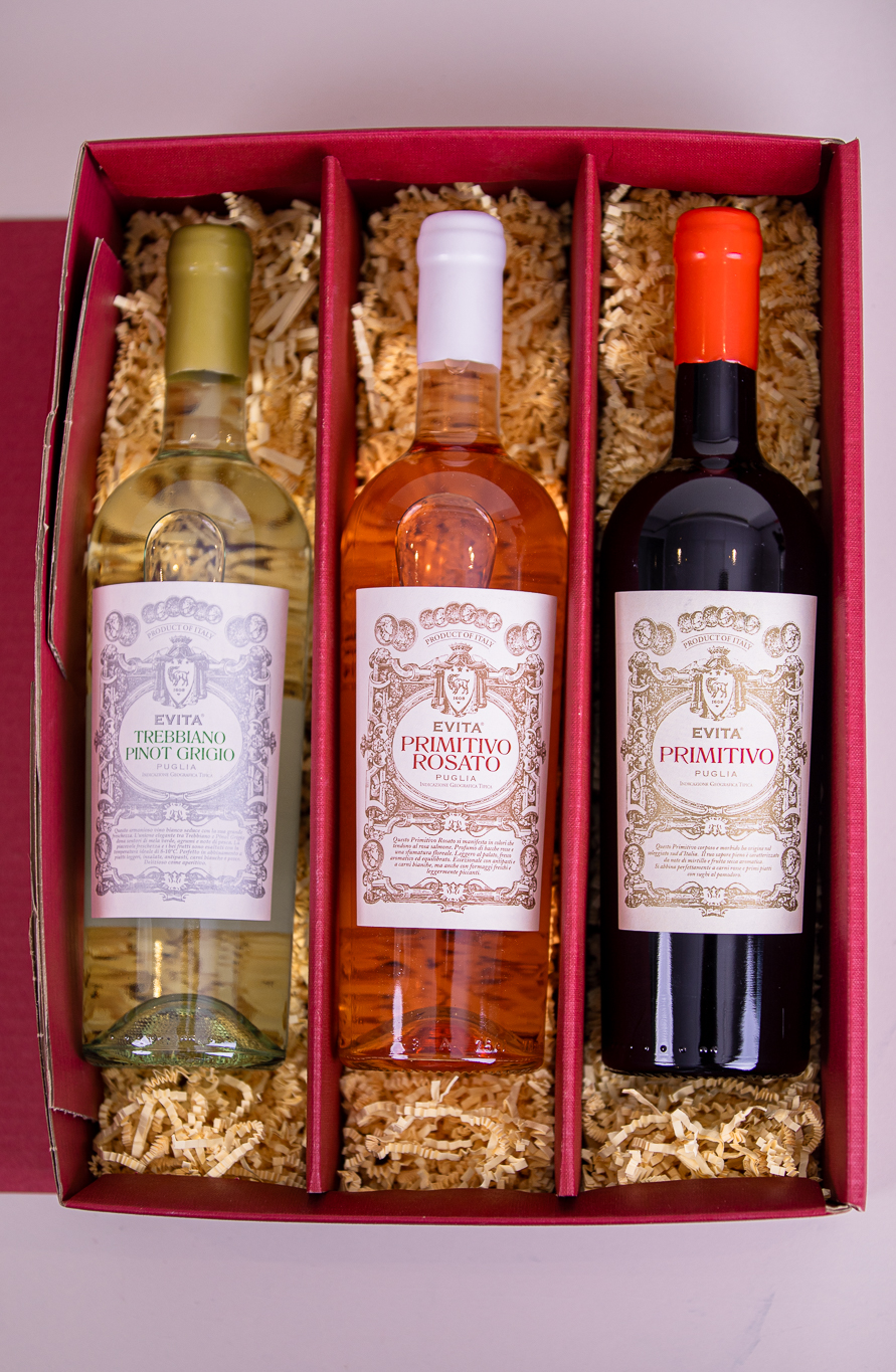 Rot, Weiß und Rosé — dieses Präsent bringt das süße Leben gleich dreimal ins Glas. Alle drei Weine stammen aus der Evita-Linie und zeigen, was Apulien kann: unkompliziert, charmant und mehrfach prämiert.
